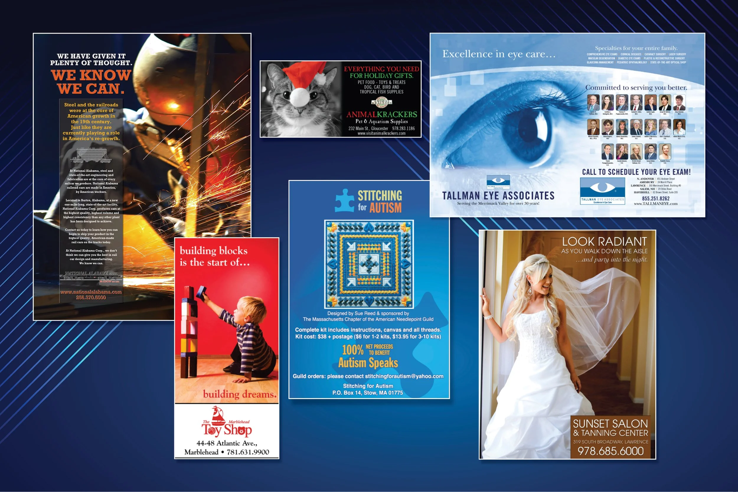 Design print advertisements in a range of sizes for North of Boston Media Group’s family of magazines, targeting high-income demographics.