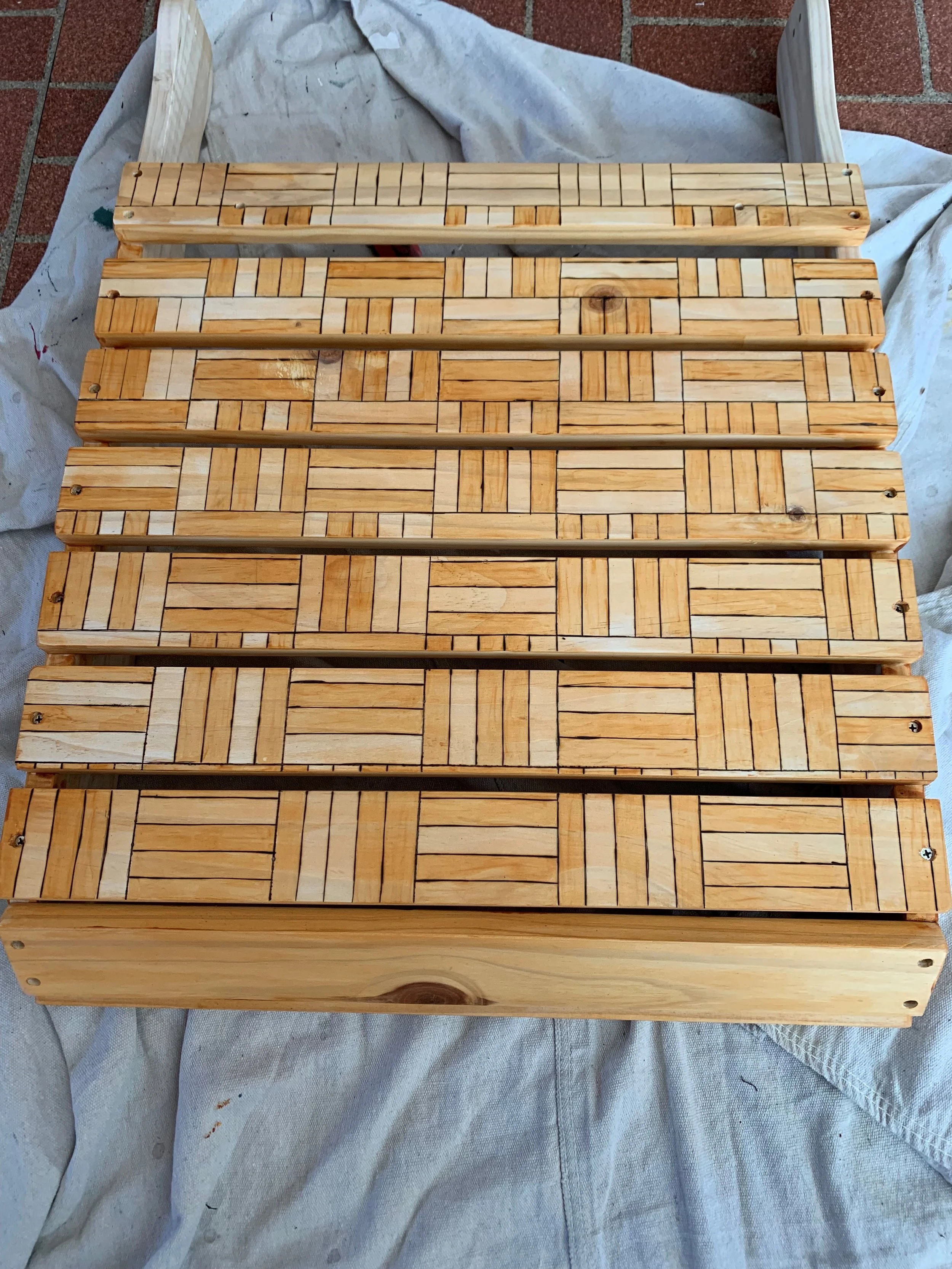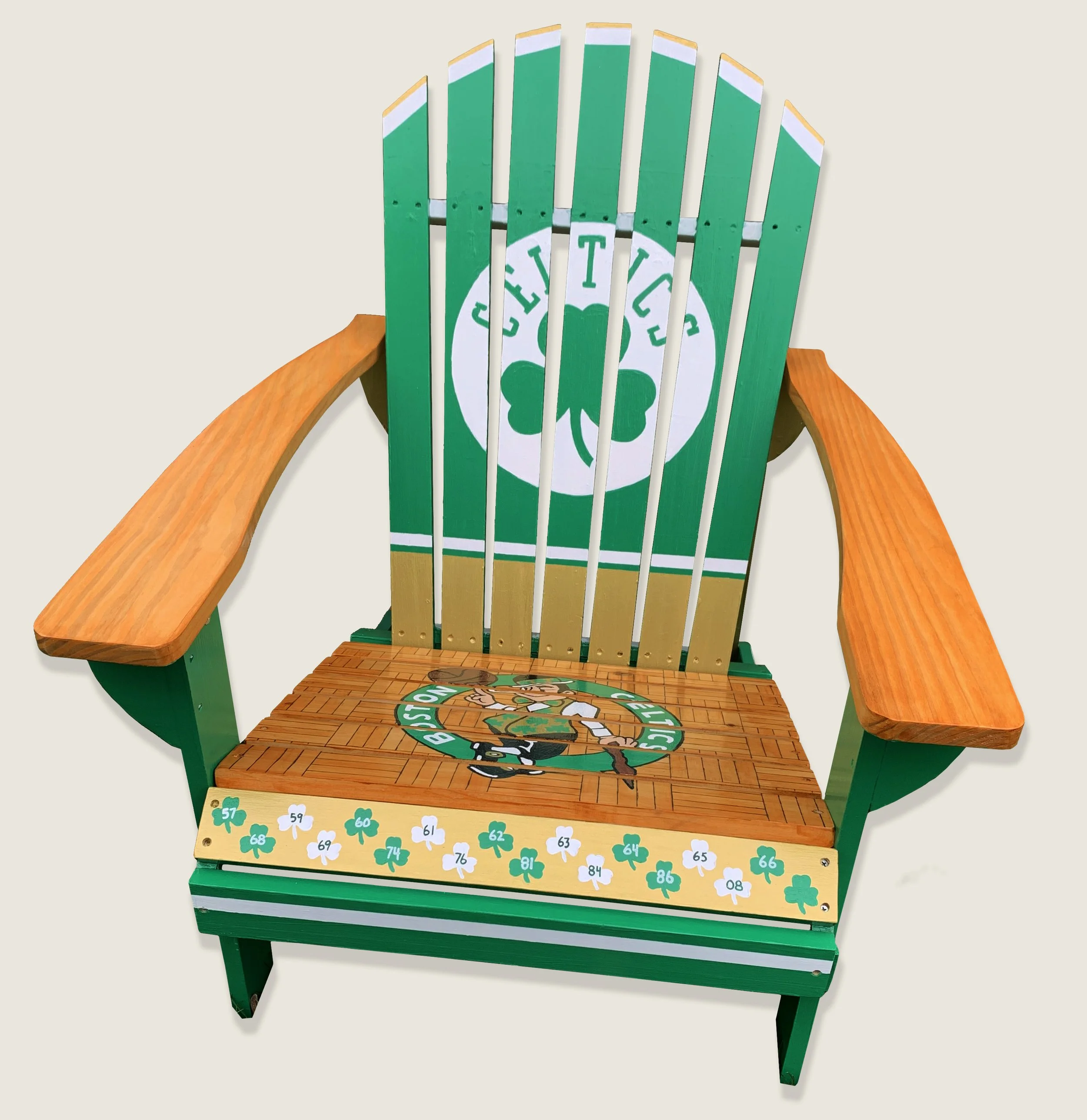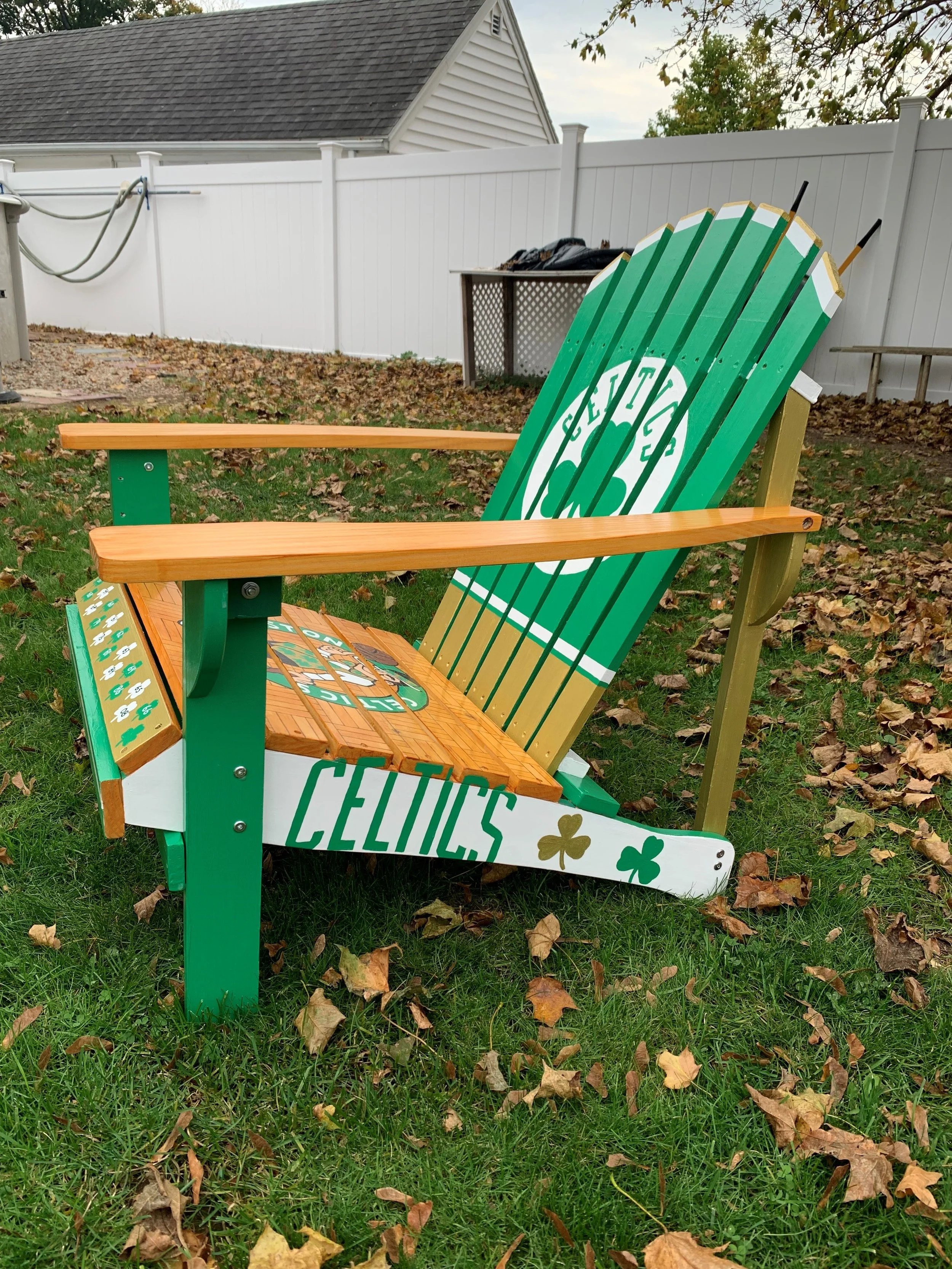 Each chair was fully sanded, custom designed, and hand painted with a Celtics theme. The seat was stained and detailed using a wood-burning iron to recreate the parquet floor pattern. The process required multiple coats of paint and waterproofing for durability. While the overall design remained consistent, a championship trophy was added to reflect the Celtics’ 2024 title, making each piece timely and unique.