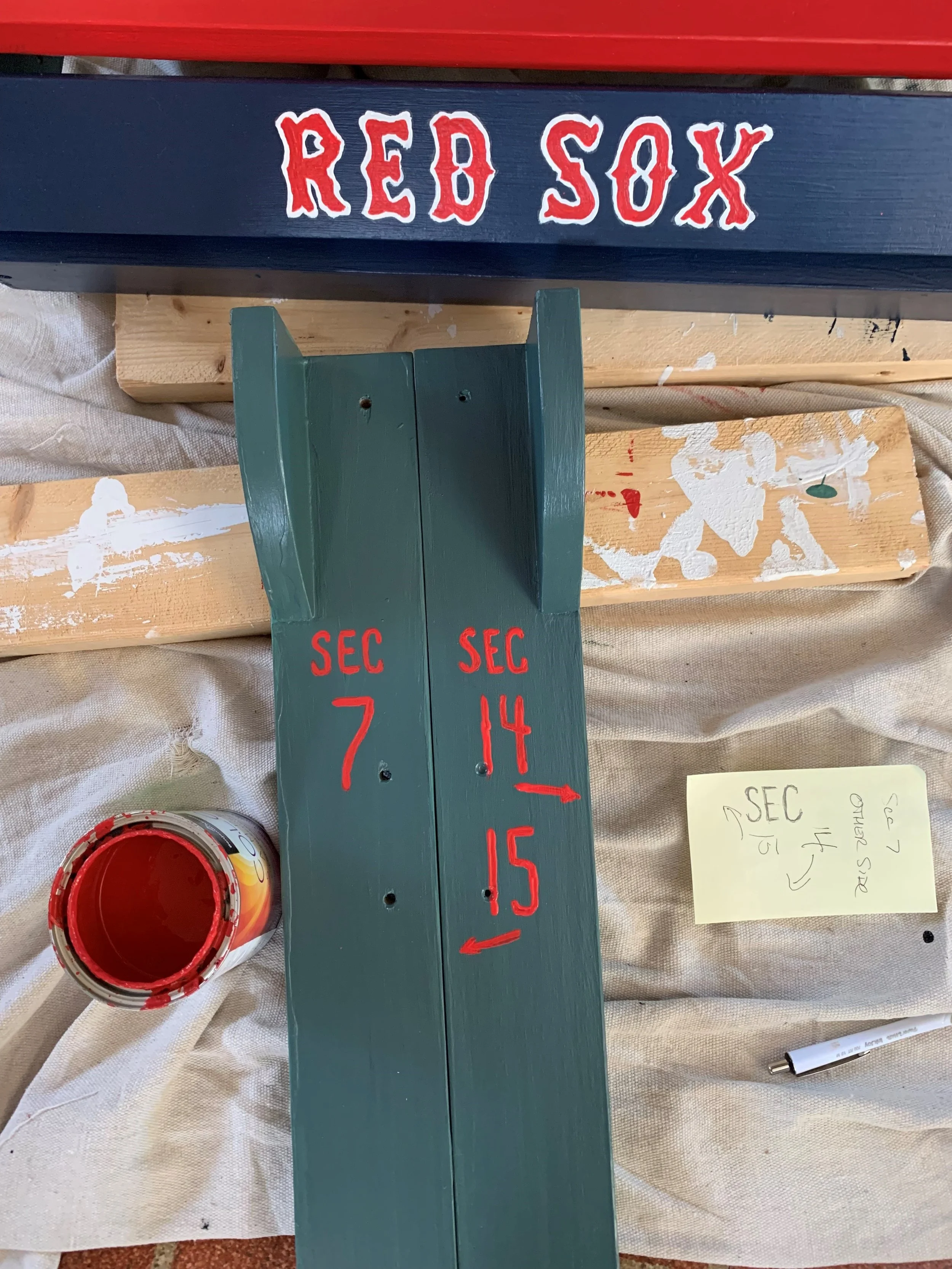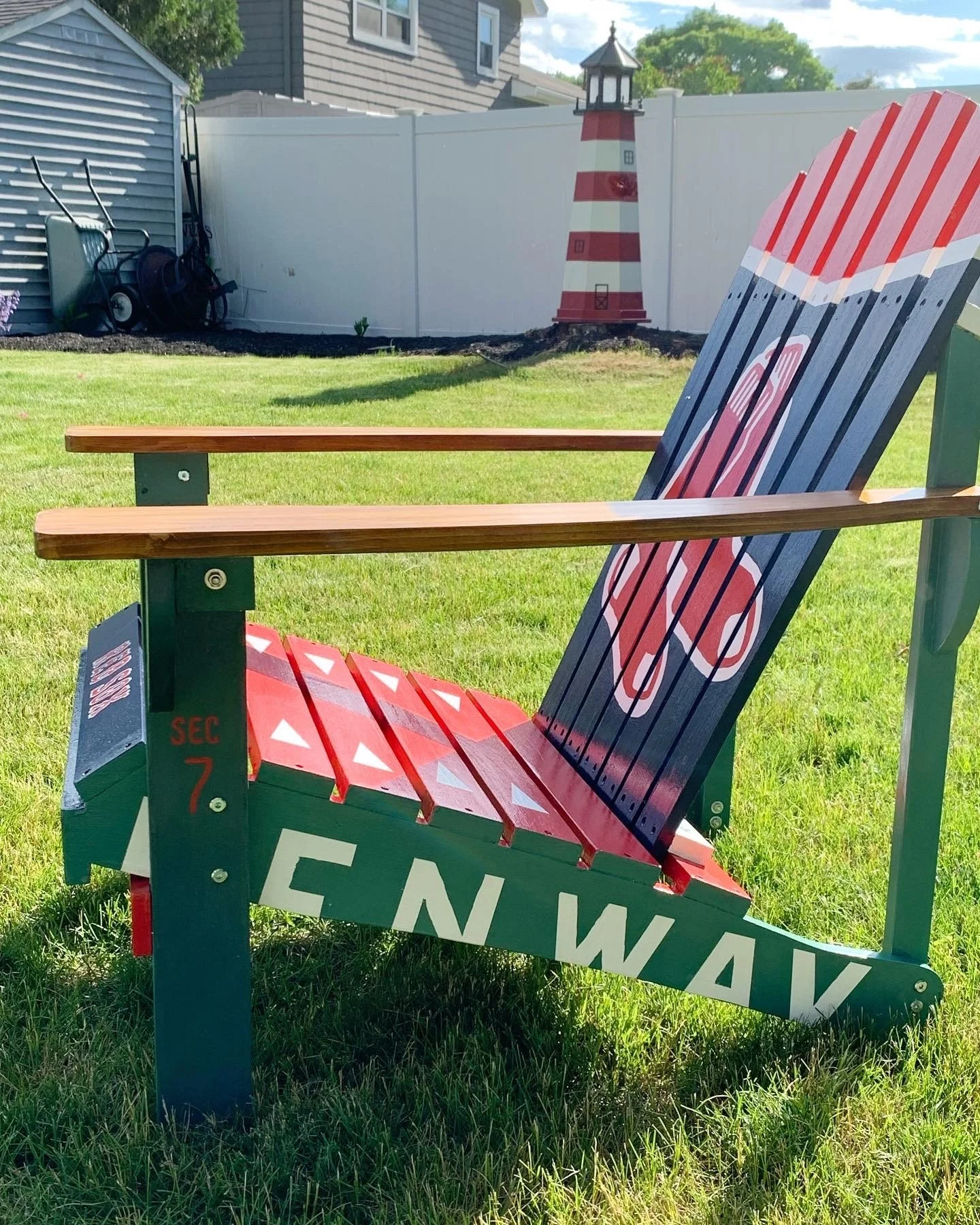Each chair was fully sanded, custom designed, and hand painted with a Red Sox theme. While the overall design remained consistent, adjustments were required to accommodate differences in chair manufacturers and construction. This ensured each finished piece maintained the same visual impact and quality despite varying specifications.